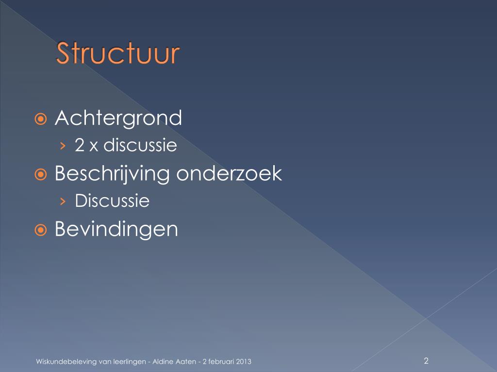 Structuur • Achtergrond • 2 x discussie • Beschrijving onderzoek • Discussie • Bevindingen Wiskundebeleving van leerlingen - Aldine Aaten - 2 februari 2013