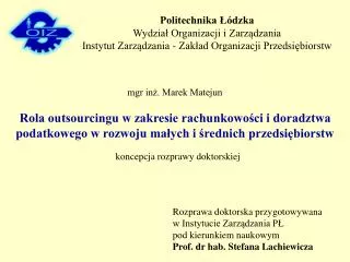 Politechnika Łódzka Wydział Organizacji i Zarządzania Instytut Zarządzania - Zakład Organizacji Przedsiębiorstw. Rola outsourcingu w zakresie rachunkowości i doradztwa podatkowego w rozwoju małych i średnich przedsiębiorstw. mgr inż. Marek Matejun. koncepcja rozprawy doktorskiej.