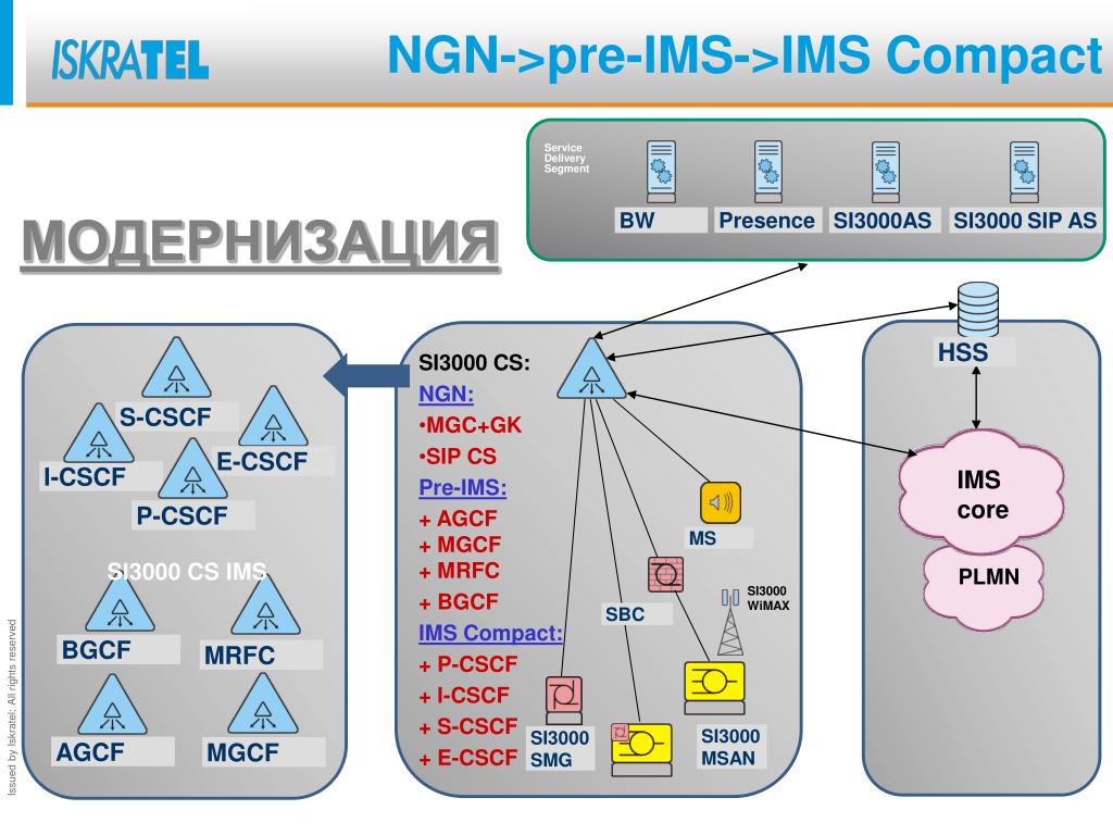 PLMN NGN->pre-IMS->IMS Compact Service Delivery Segment МОДЕРНИЗАЦИЯ Presence BW SI3000AS SI3000SIPAS HSS • SI3000 CS: • NGN: • MGC+GK • SIP CS • Pre-IMS: • + AGCF+ MGCF+ MRFC • + BGCF • IMS Compact: • + P-CSCF • + I-CSCF • + S-CSCF • + E-CSCF S-CSCF E-CSCF IMScore I-CSCF P-CSCF MS SI3000 CS IMS SI3000 WiMAX SBC BGCF MRFC SI3000MSAN SI3000SMG AGCF MGCF