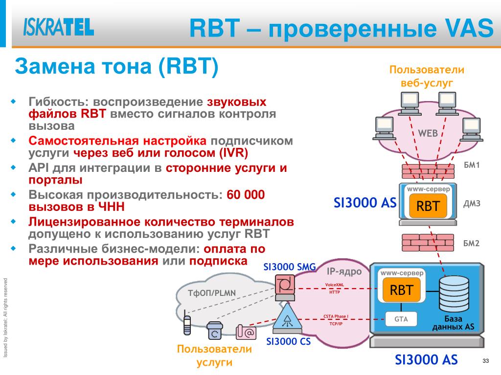 RBT – проверенные VAS Замена тона (RBT) Пользователи веб-услуг • Гибкость:воспроизведение звуковых файлов RBT вместо сигналов контроля вызова • Самостоятельная настройка подписчиком услуги через веб или голосом (IVR) • API для интеграции в сторонние услуги и порталы • Высокая производительность: 60 000 вызовов в ЧНН • Лицензированное количество терминалов допущено к использованию услуг RBT • Различные бизнес-модели: оплата по мере использования или подписка WEB БМ1 www-сервер RBT SI3000 AS ДМЗ БМ2 SI3000 SMG IP-ядро www-сервер RBT VoiceXML HTTP ТфОП/PLMN CSTA Phase I TCP/IP GTA База данных AS SI3000 CS Пользователи услуги SI3000 AS