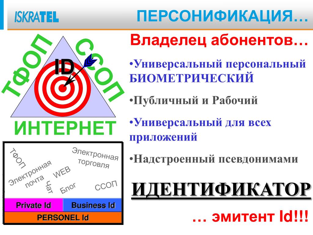 ПЕРСОНИФИКАЦИЯ… Владелец абонентов… Электроннаяторговля ТФОП Электроннаяпочта WEB ССОП Чат Блог Private Id Business Id …эмитент Id!!! PERSONEL Id ID • Универсальный персональныйБИОМЕТРИЧЕСКИЙ • Публичный и Рабочий • Универсальный для всех приложений • Надстроенный псевдонимами • ИДЕНТИФИКАТОР ССОП ТФОП ИНТЕРНЕТ