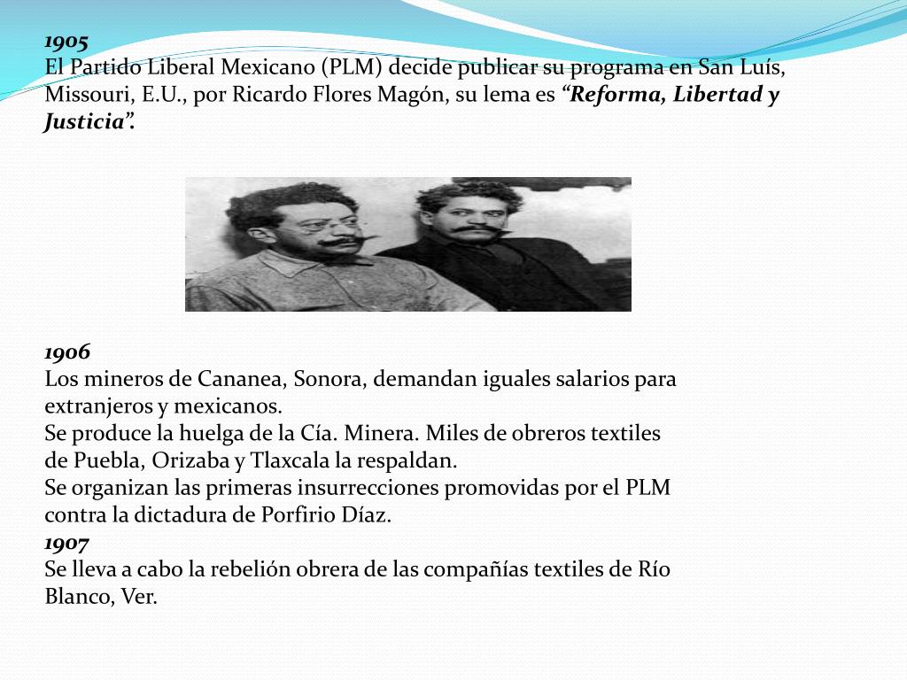 1905 El Partido Liberal Mexicano (PLM) decide publicar su programa en San Luís, Missouri, E.U., por Ricardo Flores Magón, su lema es “Reforma, Libertad y Justicia”. 1906 Los mineros de Cananea, Sonora, demandan iguales salarios para extranjeros y mexicanos. Se produce la huelga de la Cía. Minera. Miles de obreros textiles de Puebla, Orizaba y Tlaxcala la respaldan. Se organizan las primeras insurrecciones promovidas por el PLM contra la dictadura de Porfirio Díaz. 1907 Se lleva a cabo la rebelión obrera de las compañías textiles de Río Blanco, Ver.