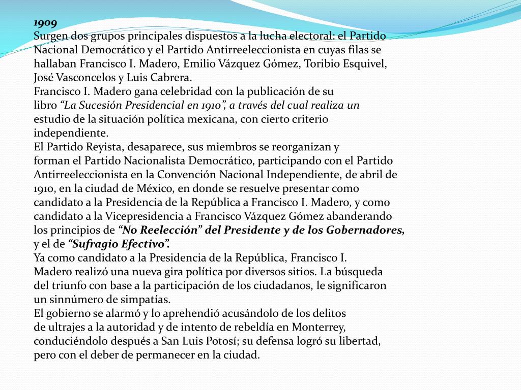 1909 Surgen dos grupos principales dispuestos a la lucha electoral: el Partido Nacional Democrático y el Partido Antirreeleccionista en cuyas filas se hallaban Francisco I. Madero, Emilio Vázquez Gómez, Toribio Esquivel, José Vasconcelos y Luis Cabrera. Francisco I. Madero gana celebridad con la publicación de su libro “La Sucesión Presidencial en 1910”, a través del cual realiza un estudio de la situación política mexicana, con cierto criterio independiente. El Partido Reyista, desaparece, sus miembros se reorganizan y forman el Partido Nacionalista Democrático, participando con el Partido Antirreeleccionista en la Convención Nacional Independiente, de abril de 1910, en la ciudad de México, en donde se resuelve presentar como candidato a la Presidencia de la República a Francisco I. Madero, y como candidato a la Vicepresidencia a Francisco Vázquez Gómez abanderando los principios de “No Reelección” del Presidente y de los Gobernadores, y el de “Sufragio Efectivo”. Ya como candidato a la Presidencia de la República, Francisco I. Madero realizó una nueva gira política por diversos sitios. La búsqueda del triunfo con base a la participación de los ciudadanos, le significaron un sinnúmero de simpatías. El gobierno se alarmó y lo aprehendió acusándolo de los delitos de ultrajes a la autoridad y de intento de rebeldía en Monterrey, conduciéndolo después a San Luis Potosí; su defensa logró su libertad, pero con el deber de permanecer en la ciudad.