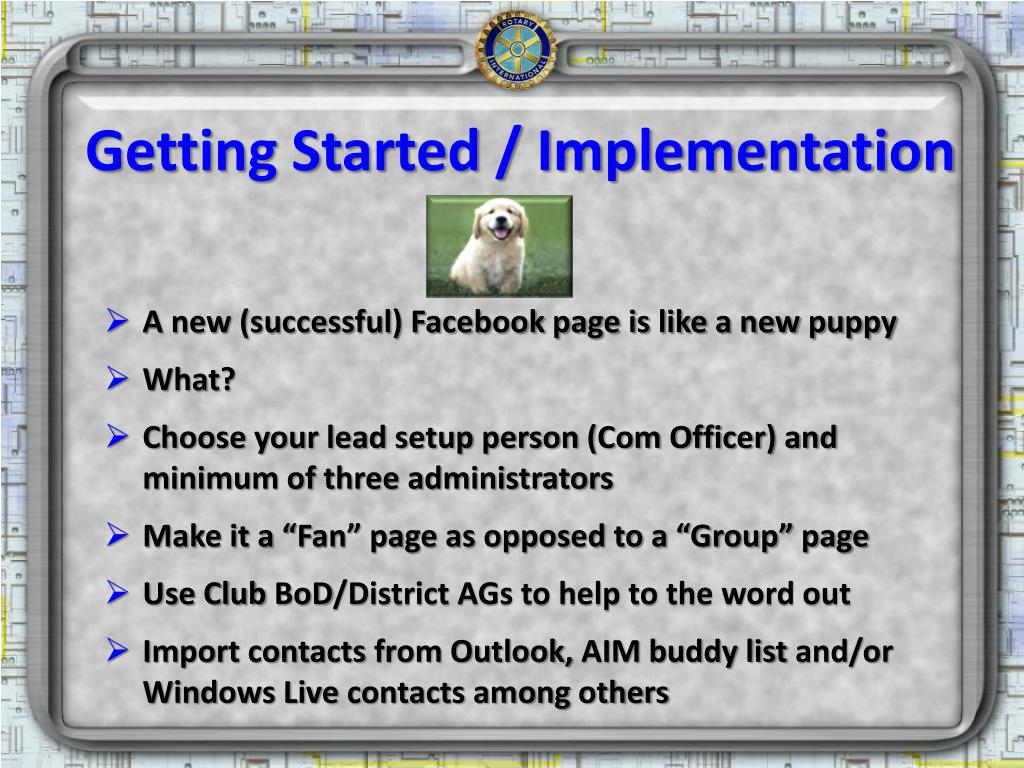 Getting Started / Implementation • A new (successful) Facebook page is like a new puppy • What? • Choose your lead setup person (Com Officer) and minimum of three administrators • Make it a “Fan” page as opposed to a “Group” page • Use Club BoD/District AGs to help to the word out • Import contacts from Outlook, AIM buddy list and/or Windows Live contacts among others