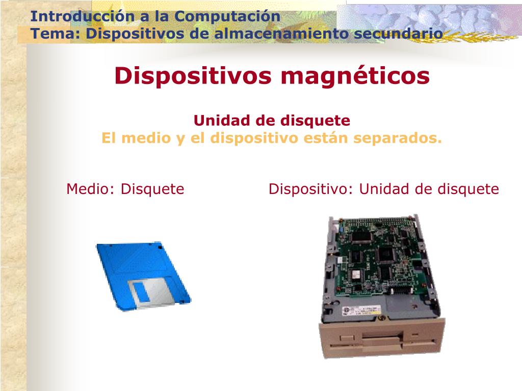 Introducción a la Computación Tema: Dispositivos de almacenamiento secundario Dispositivos magnéticos Unidad de disquete El medio y el dispositivo están separados. Medio: Disquete Dispositivo: Unidad de disquete