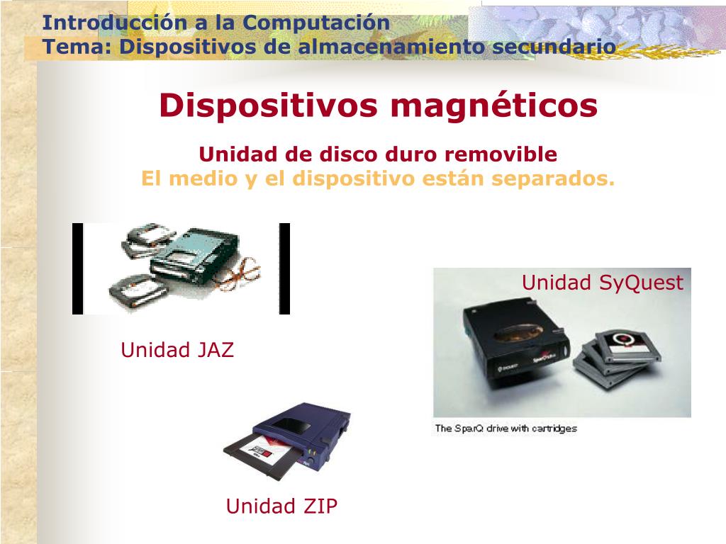 Unidad ZIP Unidad JAZ Unidad SyQuest Introducción a la Computación Tema: Dispositivos de almacenamiento secundario Dispositivos magnéticos Unidad de disco duro removible El medio y el dispositivo están separados.