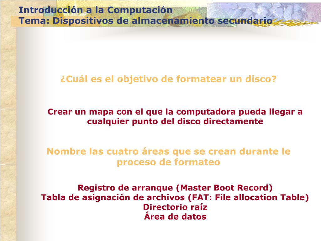 Introducción a la Computación Tema: Dispositivos de almacenamiento secundario ¿Cuál es el objetivo de formatear un disco? Crear un mapa con el que la computadora pueda llegar a cualquier punto del disco directamente Nombre las cuatro áreas que se crean durante le proceso de formateo Registro de arranque (Master Boot Record) Tabla de asignación de archivos (FAT: File allocation Table) Directorio raíz Área de datos