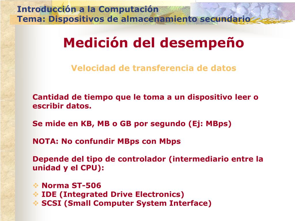 Introducción a la Computación Tema: Dispositivos de almacenamiento secundario Medición del desempeño Velocidad de transferencia de datos • Cantidad de tiempo que le toma a un dispositivo leer o escribir datos. • Se mide en KB, MB o GB por segundo (Ej: MBps) • NOTA: No confundir MBps con Mbps • Depende del tipo de controlador (intermediario entre la unidad y el CPU): • Norma ST-506 • IDE (Integrated Drive Electronics) • SCSI (Small Computer System Interface)