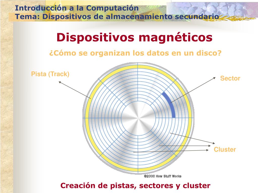 Introducción a la Computación Tema: Dispositivos de almacenamiento secundario Dispositivos magnéticos ¿Cómo se organizan los datos en un disco? Pista (Track) Sector Cluster Creación de pistas, sectores y cluster
