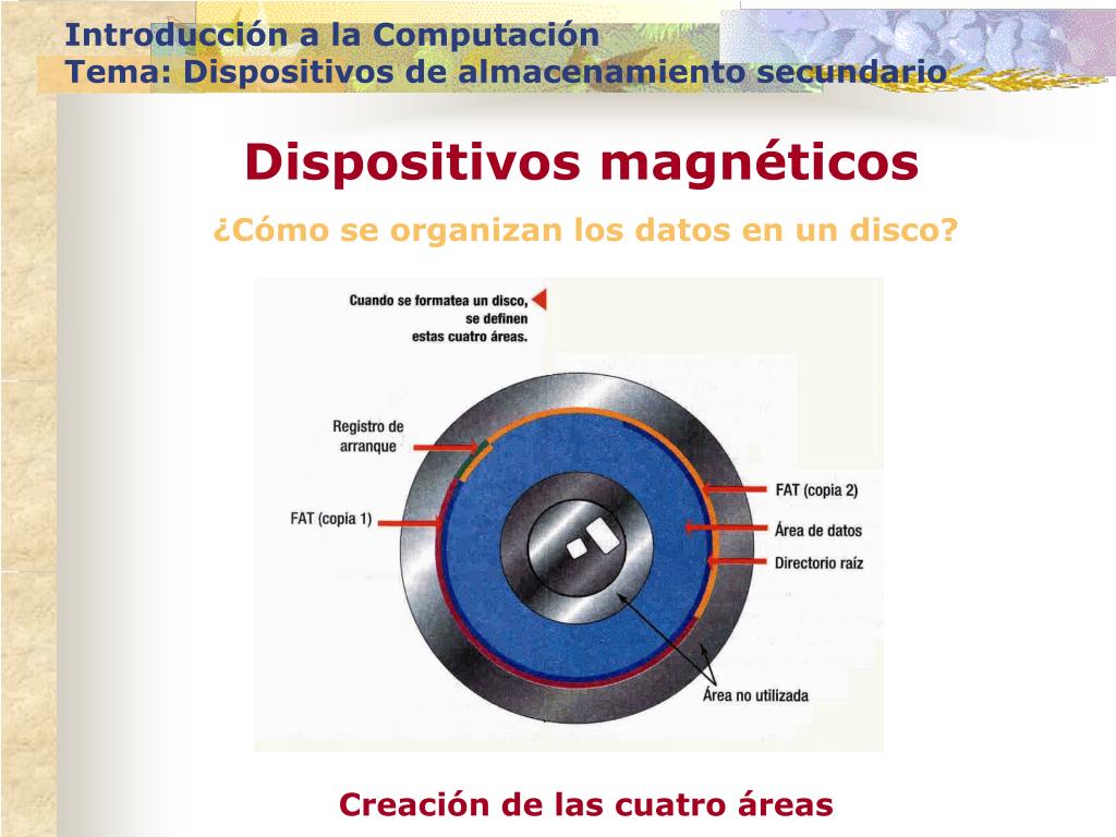 Introducción a la Computación Tema: Dispositivos de almacenamiento secundario Dispositivos magnéticos ¿Cómo se organizan los datos en un disco? Creación de las cuatro áreas
