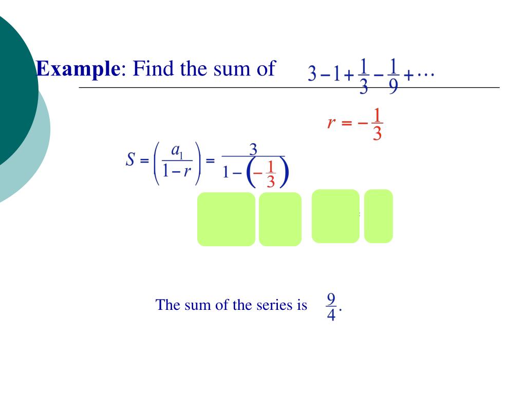 Example Determine whether each arithmetic or geometric series is convergent or divergent. • 1/8 + 3/20 + 9/50 + 27/125 + . . . • r=6/5 |r|>1 divergent • 18.75+17.50+16.25+15.00+ . . . • Arithmetic series divergent • 65 + 13 + 2 3/5 + 13/25 . . . • r=1/5 |r|<1 convergent