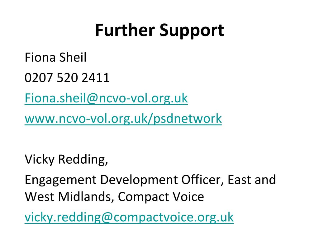 Further Support Fiona Sheil 0207 520 2411 Fiona.sheil@ncvo-vol.org.uk www.ncvo-vol.org.uk/psdnetwork Vicky Redding, Engagement Development Officer, East and West Midlands, Compact Voice vicky.redding@compactvoice.org.uk