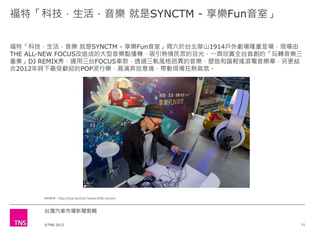 福特「科技.生活.音樂 就是SYNCTM - 享樂Fun音室」 • 福特「科技.生活.音樂 就是SYNCTM - 享樂Fun音室」周六於台北華山1914戶外劇場隆重登場,現場由THE ALL-NEW FOCUS改造成的大型音樂點播機,吸引熱情民眾的目光,一齊欣賞全台首創的「玩轉音樂三重奏」DJ REMIX秀,運用三台FOCUS車款,透過三軌風格迥異的音樂,塑造和諧輕搖滾電音樂章,另更結合2012年時下最受歡迎的POP流行樂,展演奔放意境,帶動現場狂熱氣氛。 SOURCE : http://incar.tw/Ford-Taiwan-SYNC-concert-