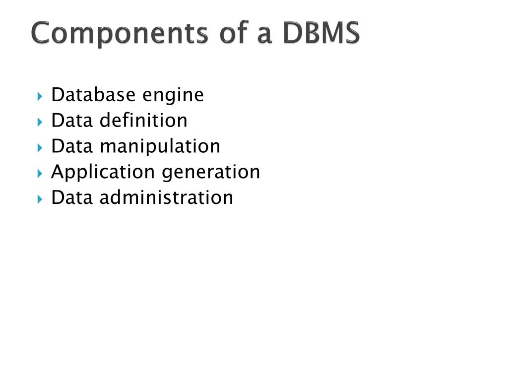 Components of a DBMS • Database engine • Data definition • Data manipulation • Application generation • Data administration