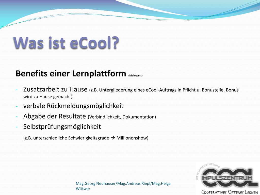 Was ist eCool? • Benefits einer Lernplattform (Mehrwert) • Zusatzarbeit zu Hause (z.B. Untergliederung eines eCool-Auftrags in Pflicht u. Bonusteile, Bonus wird zu Hause gemacht) • verbale Rückmeldungsmöglichkeit • Abgabe der Resultate (Verbindlichkeit, Dokumentation) • Selbstprüfungsmöglichkeit (z.B. unterschiedliche Schwierigkeitsgrade Millionenshow) Mag.Georg Neuhauser/Mag.Andreas Riepl/Mag.Helga Wittwer