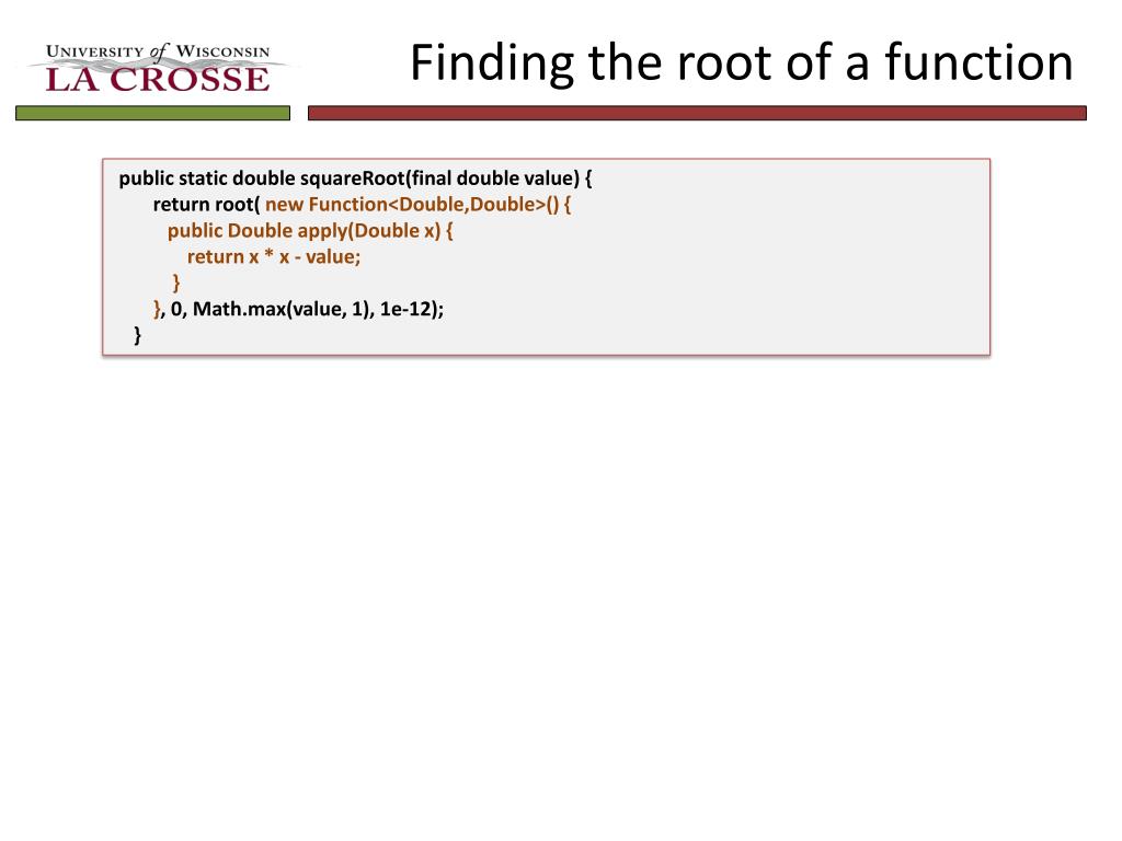 Finding the root of a function public static double squareRoot(final double value) { return root( new Function<Double,Double>() { public Double apply(Double x) { return x * x - value; } }, 0, Math.max(value, 1), 1e-12); }
