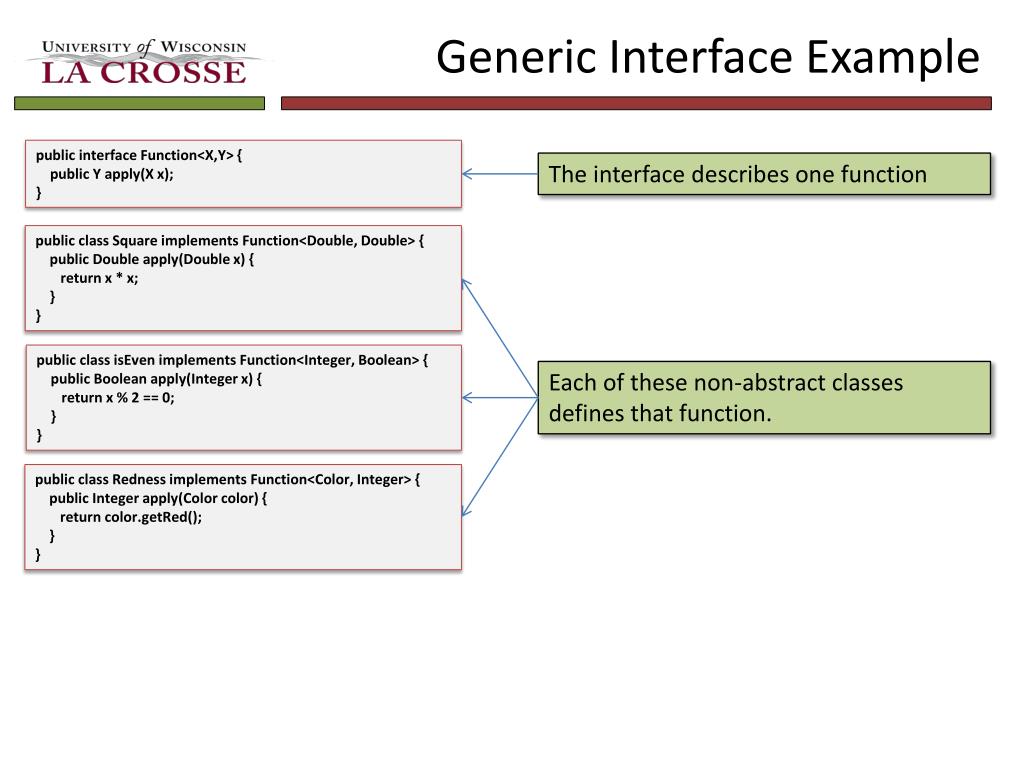 Generic Interface Example public interface Function<X,Y> { public Y apply(X x); } The interface describes one function public class Square implements Function<Double, Double> { public Double apply(Double x) { return x * x; } } public class isEven implements Function<Integer, Boolean> { public Boolean apply(Integer x) { return x % 2 == 0; } } Each of these non-abstract classes defines that function. public class Redness implements Function<Color, Integer> { public Integer apply(Color color) { return color.getRed(); } }