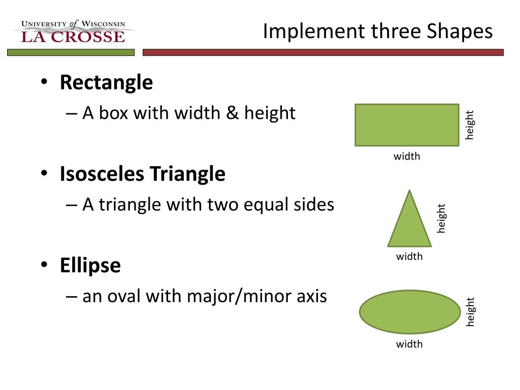Implement three Shapes • Rectangle • A box with width & height • Isosceles Triangle • A triangle with two equal sides • Ellipse • an oval with major/minor axis height width height width height width