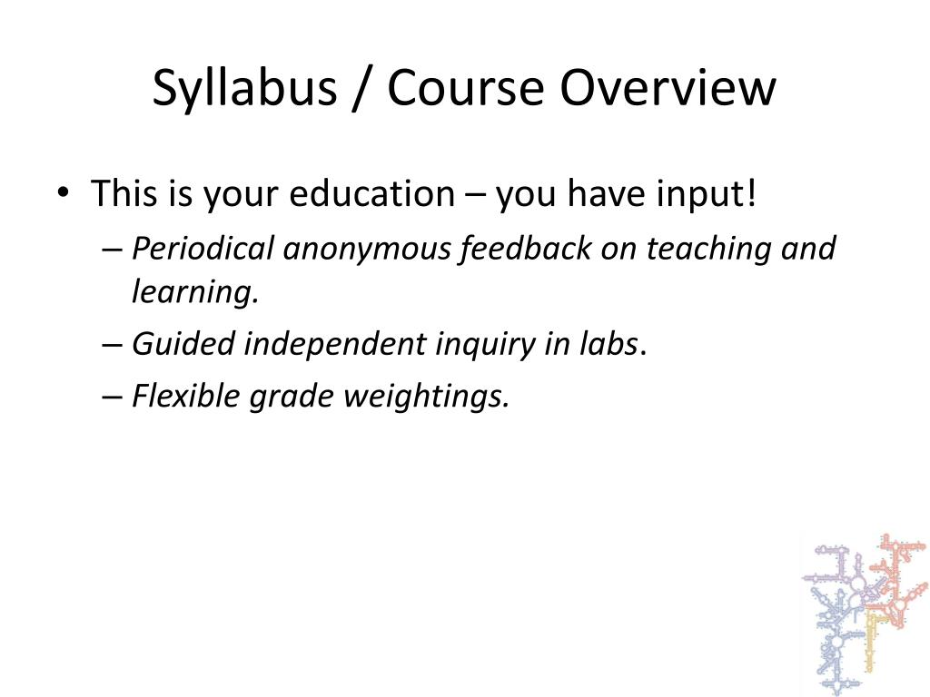 Syllabus / Course Overview • This is your education – you have input! • Periodical anonymous feedback on teaching and learning. • Guided independent inquiry in labs. • Flexible grade weightings.