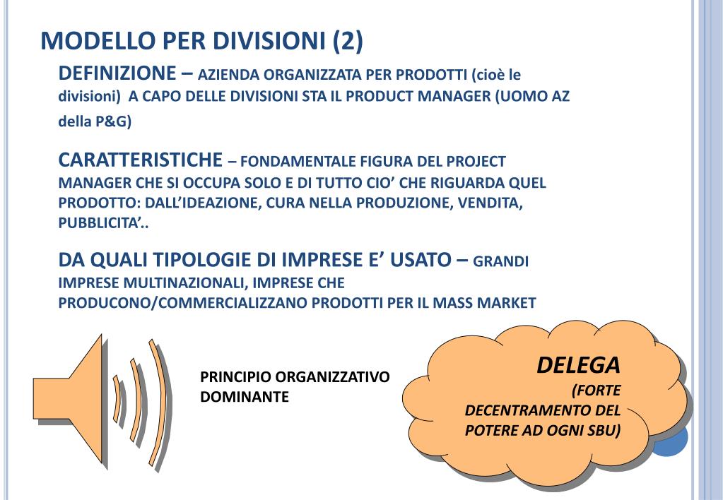 MODELLO PER DIVISIONI (2) • DEFINIZIONE – AZIENDA ORGANIZZATA PER PRODOTTI (cioè le divisioni) A CAPO DELLE DIVISIONI STA IL PRODUCT MANAGER (UOMO AZ della P&G) • CARATTERISTICHE – FONDAMENTALE FIGURA DEL PROJECT MANAGER CHE SI OCCUPA SOLO E DI TUTTO CIO’ CHE RIGUARDA QUEL PRODOTTO: DALL’IDEAZIONE, CURA NELLA PRODUZIONE, VENDITA, PUBBLICITA’.. • DA QUALI TIPOLOGIE DI IMPRESE E’ USATO – GRANDI IMPRESE MULTINAZIONALI, IMPRESE CHE PRODUCONO/COMMERCIALIZZANO PRODOTTI PER IL MASS MARKET DELEGA (FORTE DECENTRAMENTO DEL POTERE AD OGNI SBU) PRINCIPIO ORGANIZZATIVO DOMINANTE