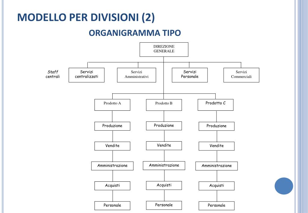 DIREZIONE GENERALE Servizi centralizzati Servizi Amministrativi Servizi Personale Servizi Commerciali Staff centrali Prodotto A Prodotto C Prodotto B Produzione Produzione Produzione Vendite Vendite Vendite Amministrazione Amministrazione Amministrazione Acquisti Acquisti Acquisti Personale Personale Personale MODELLO PER DIVISIONI (2) ORGANIGRAMMA TIPO