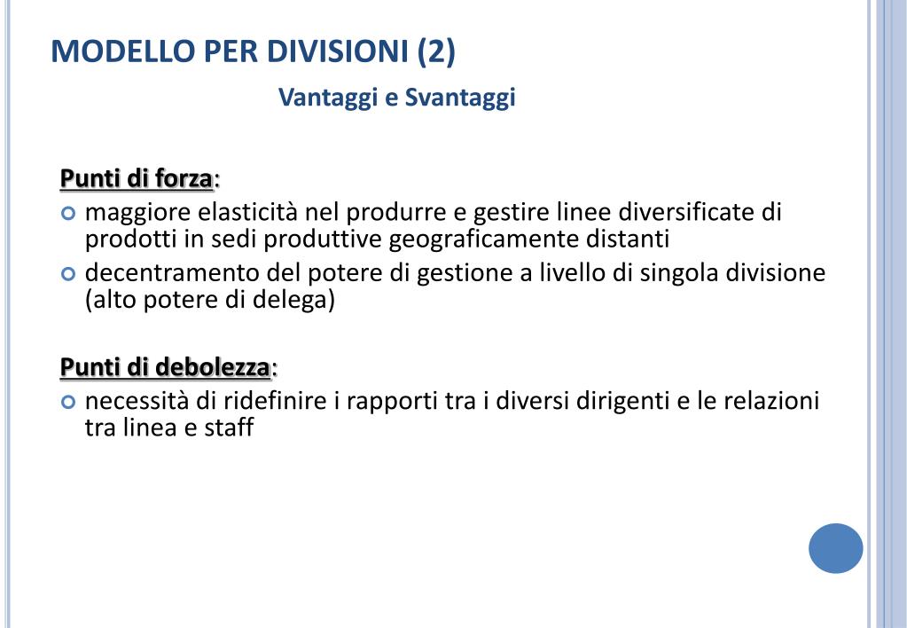 MODELLO PER DIVISIONI (2) Vantaggi e Svantaggi Punti di forza: • maggiore elasticità nel produrre e gestire linee diversificate di prodotti in sedi produttive geograficamente distanti • decentramento del potere di gestione a livello di singola divisione (alto potere di delega) Punti di debolezza: • necessità di ridefinire i rapporti tra i diversi dirigenti e le relazioni tra linea e staff