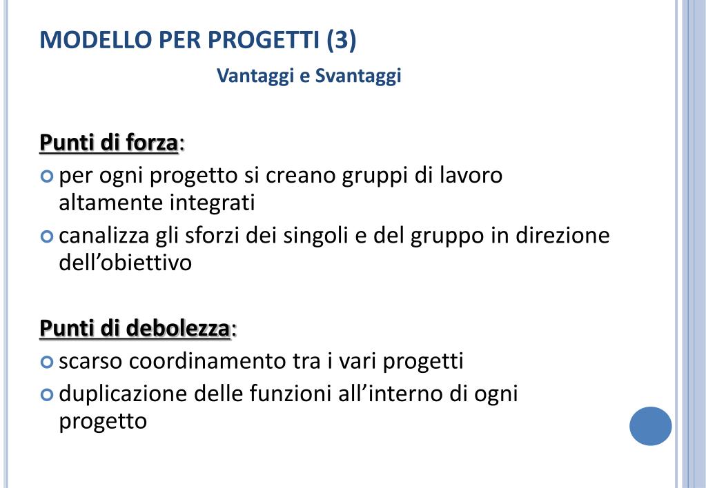 MODELLO PER PROGETTI (3) Vantaggi e Svantaggi Punti di forza: • per ogni progetto si creano gruppi di lavoro altamente integrati • canalizza gli sforzi dei singoli e del gruppo in direzione dell’obiettivo Punti di debolezza: • scarso coordinamento tra i vari progetti • duplicazione delle funzioni all’interno di ogni progetto