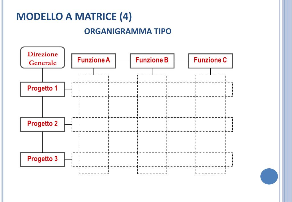 MODELLO A MATRICE (4) DEFINIZIONE – FORMA ORGANIZZATIVA INTERMEDIA POSTA TRA LA STRUTTURA FUNZIONALE E LA STRUTTURA PER PROGETTI CARATTERISTICHE – FORMA IBRIDA CHE EREDITA - DALL’ORGANIZZAZIONE FUNZIONALE, LA SPECIALIZZAZIONE E L’ALTA PROFESSIONALIZZAZIONE DEI GRUPPI FUNZIONALI - DALL’ORGANIZZAZIONE PER PROGETTI, LA CAPACITÀ DI REALIZZARE PRODOTTI INNOVATIVI IN AMBITI MULTIDISCIPLINARI ALTAMENTE INTEGRATI DA QUALI TIPOLOGIE DI IMPRESE E’ USATO - COMPLESSE COMPLESSITA’ PRINCIPIO ORGANIZZATIVO DOMINANTE