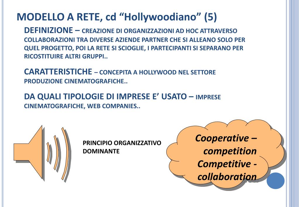 MODELLO A RETE, cd “Hollywoodiano” (5) • DEFINIZIONE – CREAZIONE DI ORGANIZZAZIONI AD HOC ATTRAVERSO COLLABORAZIONI TRA DIVERSE AZIENDE PARTNER CHE SI ALLEANO SOLO PER QUEL PROGETTO, POI LA RETE SI SCIOGLIE, I PARTECIPANTI SI SEPARANO PER RICOSTITUIRE ALTRI GRUPPI.. • CARATTERISTICHE – CONCEPITA A HOLLYWOOD NEL SETTORE PRODUZIONE CINEMATOGRAFICHE.. • DA QUALI TIPOLOGIE DI IMPRESE E’ USATO – IMPRESE CINEMATOGRAFICHE, WEB COMPANIES.. Cooperative – competition Competitive - collaboration PRINCIPIO ORGANIZZATIVO DOMINANTE