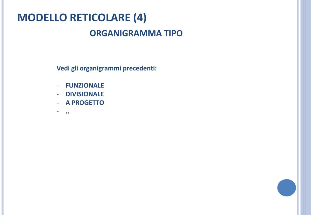 MODELLO RETICOLARE (4) ORGANIGRAMMA TIPO • Vedi gli organigrammi precedenti: • FUNZIONALE • DIVISIONALE • A PROGETTO • ..