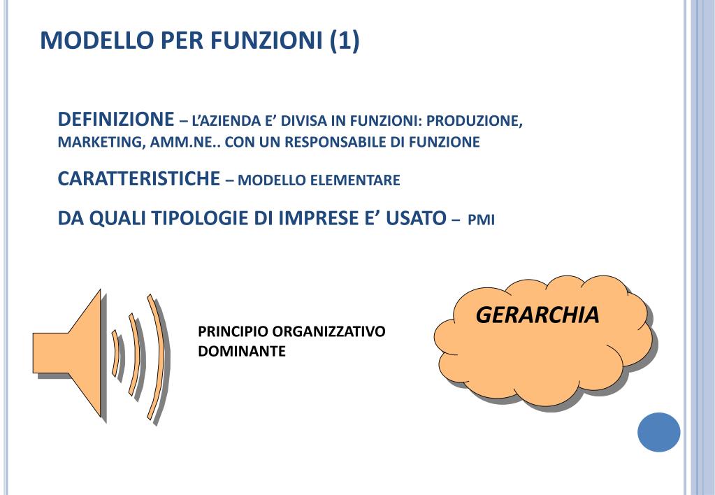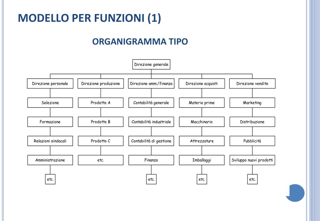 MODELLO PER FUNZIONI (1) • DEFINIZIONE – L’AZIENDA E’ DIVISA IN FUNZIONI: PRODUZIONE, MARKETING, AMM.NE.. CON UN RESPONSABILE DI FUNZIONE • CARATTERISTICHE – MODELLO ELEMENTARE • DA QUALI TIPOLOGIE DI IMPRESE E’ USATO – PMI GERARCHIA PRINCIPIO ORGANIZZATIVO DOMINANTE