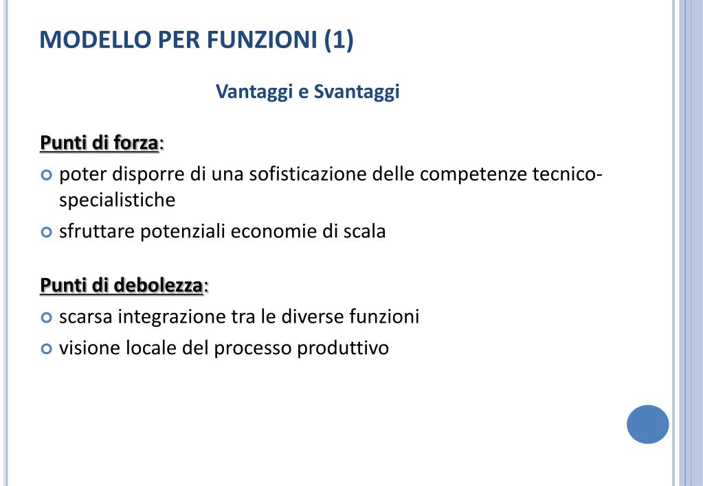 MODELLO PER FUNZIONI (1) Vantaggi e Svantaggi Punti di forza: • poter disporre di una sofisticazione delle competenze tecnico-specialistiche • sfruttare potenziali economie di scala Punti di debolezza: • scarsa integrazione tra le diverse funzioni • visione locale del processo produttivo
