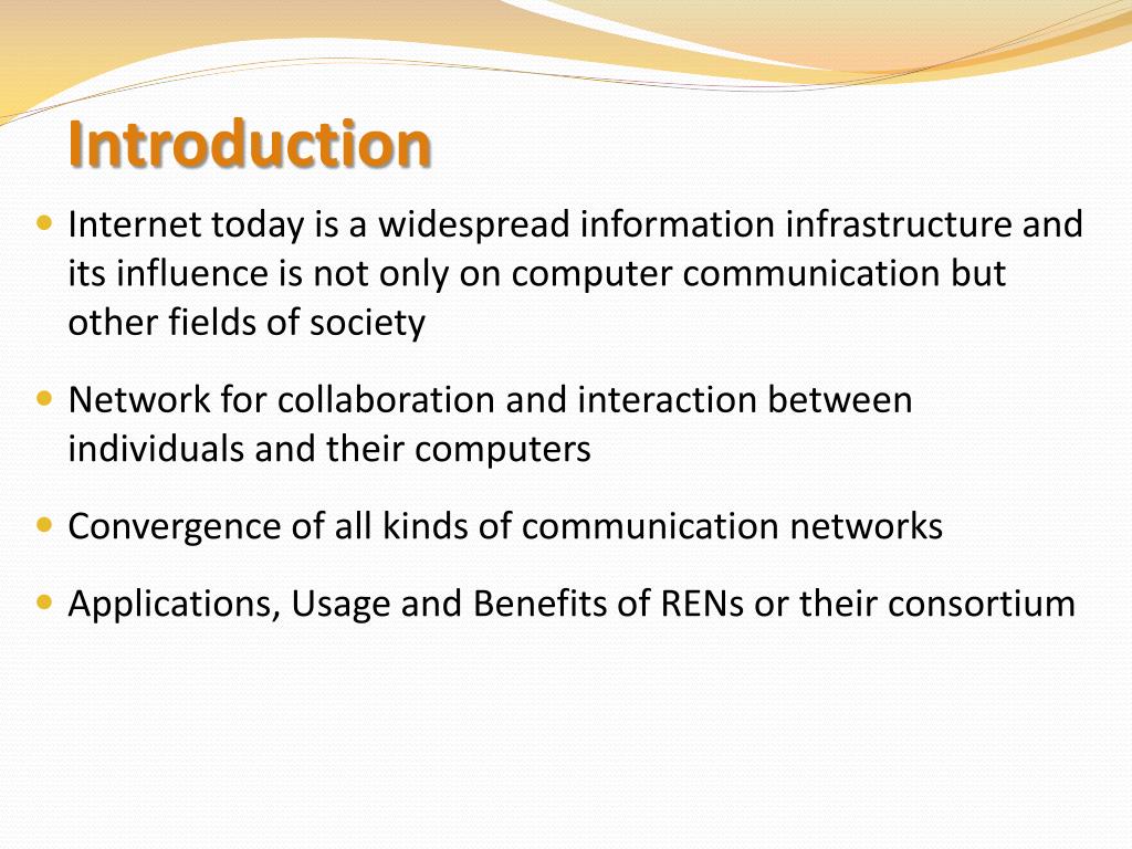 Introduction • Internet today is a widespread information infrastructure and its influence is not only on computer communication but other fields of society • Network for collaboration and interaction between individuals and their computers • Convergence of all kinds of communication networks • Applications, Usage and Benefits of RENs or their consortium