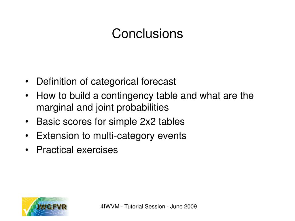 Conclusions • Definition of categorical forecast • How to build a contingency table and what are the marginal and joint probabilities • Basic scores for simple 2x2 tables • Extension to multi-category events • Practical exercises 4IWVM - Tutorial Session - June 2009