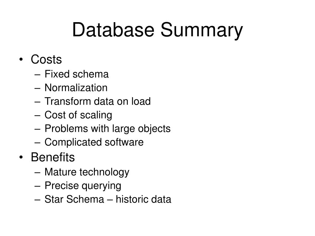 Database Summary • Costs • Fixed schema • Normalization • Transform data on load • Cost of scaling • Problems with large objects • Complicated software • Benefits • Mature technology • Precise querying • Star Schema – historic data