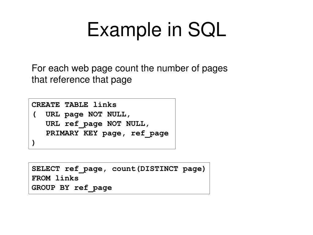 Example in SQL For each web page count the number of pages that reference that page CREATE TABLE links ( URL page NOT NULL, URL ref_page NOT NULL, PRIMARY KEY page, ref_page ) SELECT ref_page, count(DISTINCT page) FROM links GROUP BY ref_page