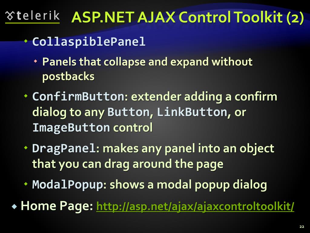 ASP.NET AJAX Control Toolkit • Collection of AJAX components • Ready-to-go samples • Comes with full source code and documentation • SDK to simplify the creation and re-use custom AJAX-enabled ASP.NET controls • Some controls: • CascadingDropDown • Link drop-downs, with asynchronous population and no postbacks 21
