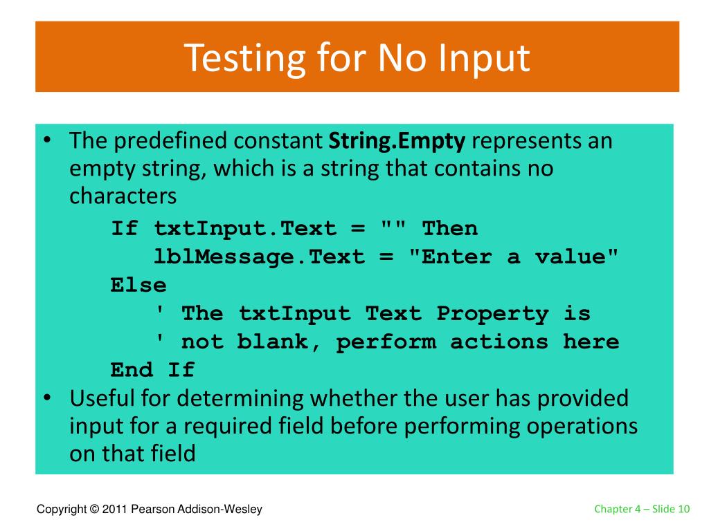 Testing for No Input • The predefined constant String.Empty represents an empty string, which is a string that contains no characters • Useful for determining whether the user has provided input for a required field before performing operations on that field If txtInput.Text = "" Then lblMessage.Text = "Enter a value" Else ' The txtInput Text Property is ' not blank, perform actions here End If