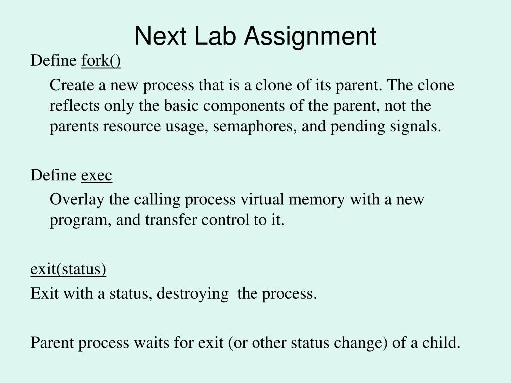 Next Lab Assignment Define fork() Create a new process that is a clone of its parent. The clone reflects only the basic components of the parent, not the parents resource usage, semaphores, and pending signals. Define exec Overlay the calling process virtual memory with a new program, and transfer control to it. exit(status) Exit with a status, destroying the process. Parent process waits for exit (or other status change) of a child.