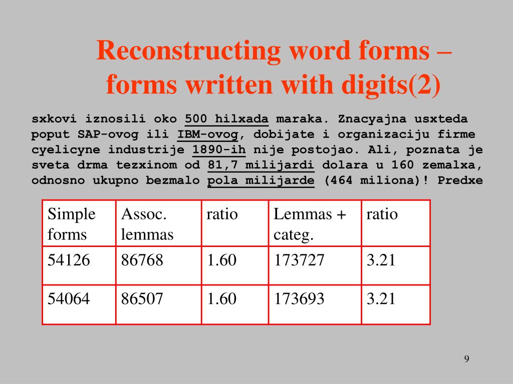 Reconstructing word forms – forms written with digits(2) sxkovi iznosili oko 500 hilxada maraka. Znacyajna usxteda poput SAP-ovog ili IBM-ovog, dobijate i organizaciju firme cyelicyne industrije 1890-ih nije postojao. Ali, poznata je sveta drma tezxinom od 81,7 milijardi dolara u 160 zemalxa, odnosno ukupno bezmalo pola milijarde (464 miliona)! Predxe