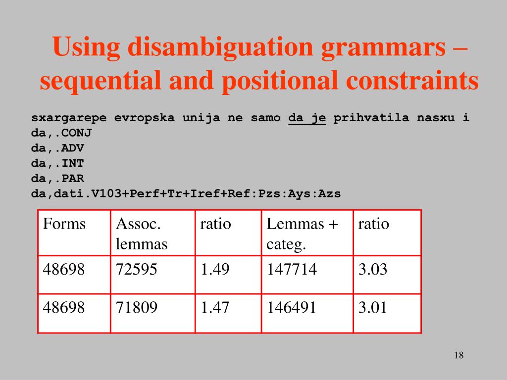 Using disambiguation grammars – sequential and positional constraints sxargarepe evropska unija ne samo da je prihvatila nasxu i da,.CONJ da,.ADV da,.INT da,.PAR da,dati.V103+Perf+Tr+Iref+Ref:Pzs:Ays:Azs