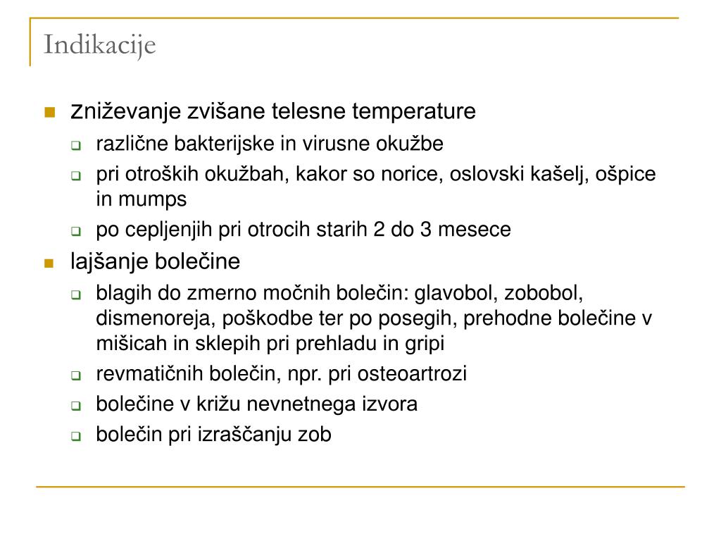 Indikacije • zniževanje zvišane telesne temperature • različne bakterijske in virusne okužbe • pri otroških okužbah, kakor so norice, oslovski kašelj, ošpice in mumps • po cepljenjih pri otrocih starih 2 do 3 mesece • lajšanje bolečine • blagih do zmerno močnih bolečin: glavobol, zobobol, dismenoreja, poškodbe ter po posegih, prehodne bolečine v mišicah in sklepih pri prehladu in gripi • revmatičnih bolečin, npr. pri osteoartrozi • bolečine v križu nevnetnega izvora • bolečin pri izraščanju zob
