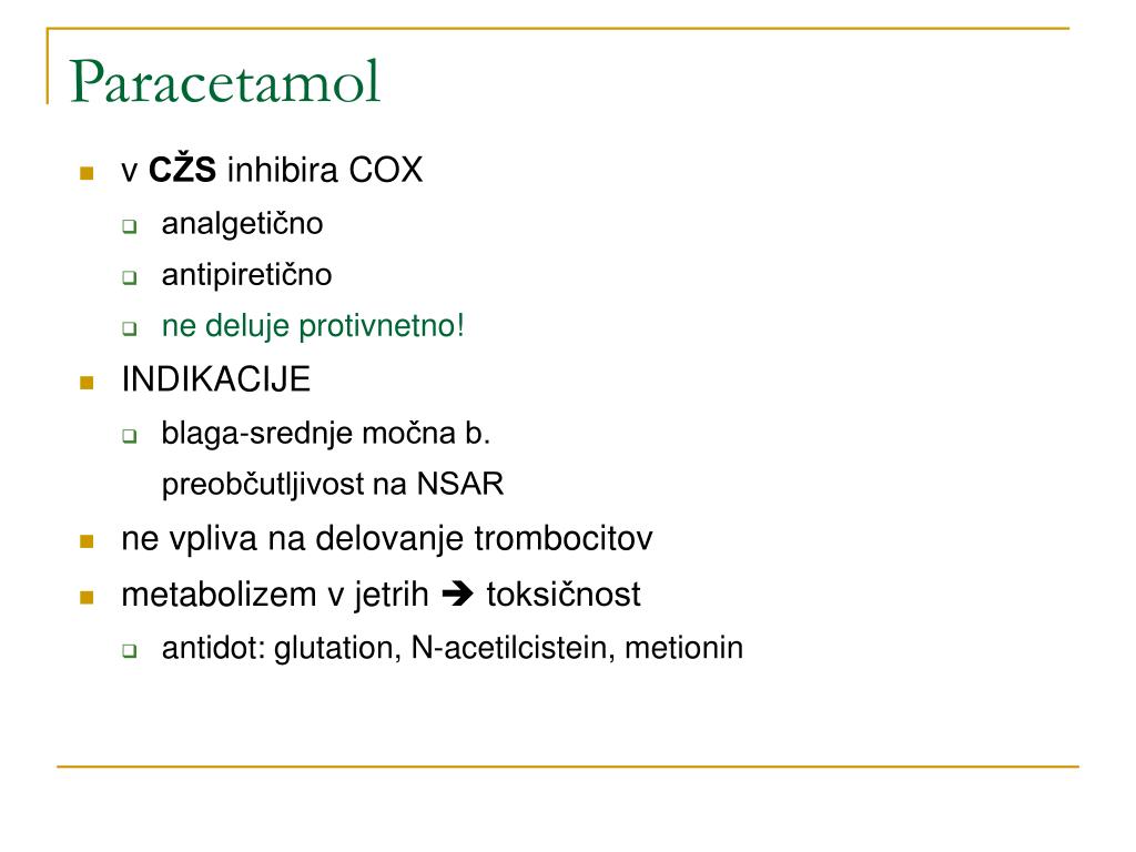v CŽS inhibira COX analgetično antipiretično ne deluje protivnetno! INDIKACIJE blaga-srednje močna b. preobčutljivost na NSAR ne vpliva na delovanje trombocitov metabolizem v jetrih toksičnost antidot: glutation, N-acetilcistein, metionin Paracetamol
