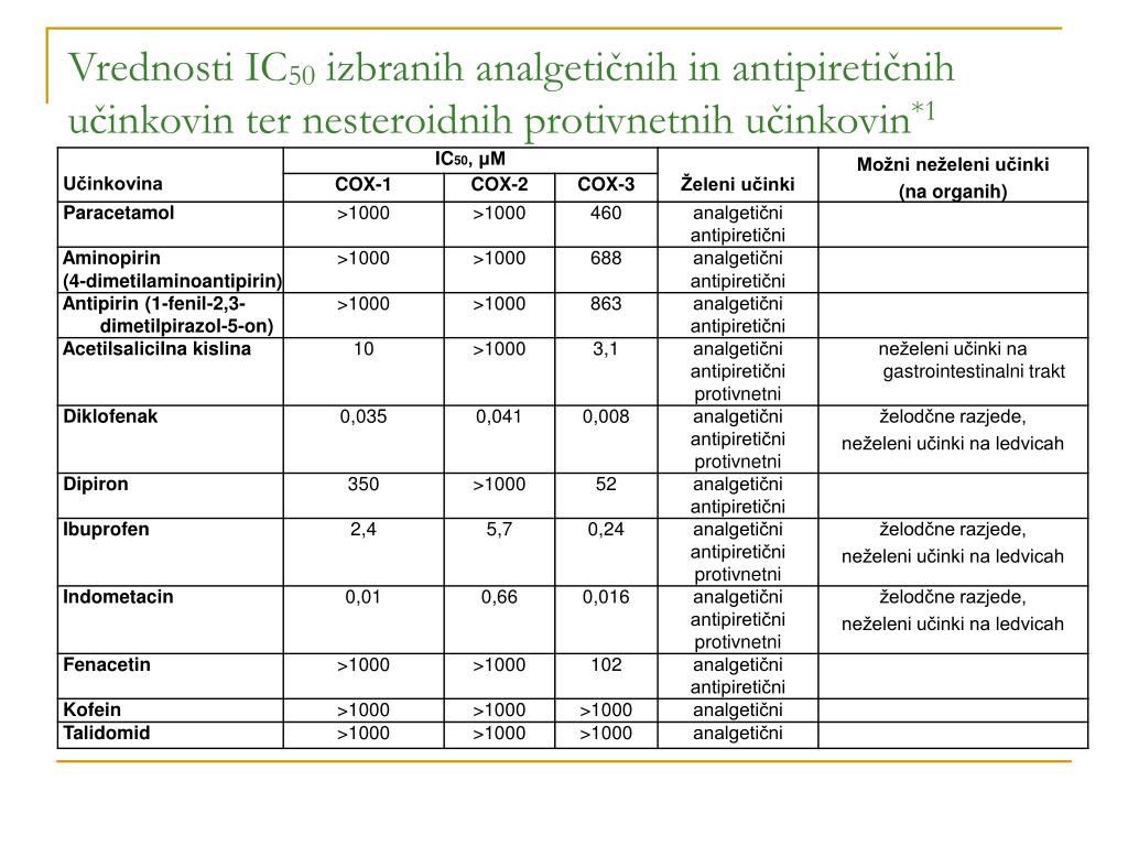 Vrednosti IC50 izbranih analgetičnih in antipiretičnih učinkovin ter nesteroidnih protivnetnih učinkovin*1