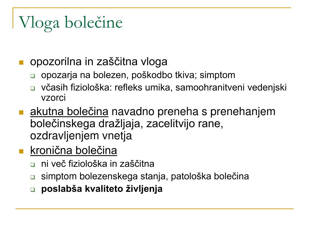Vloga bolečine • opozorilna in zaščitna vloga • opozarja na bolezen, poškodbo tkiva; simptom • včasih fiziološka: refleks umika, samoohranitveni vedenjski vzorci • akutna bolečina navadno preneha s prenehanjem bolečinskega dražljaja, zacelitvijo rane, ozdravljenjem vnetja • kronična bolečina • ni več fiziološka in zaščitna • simptom bolezenskega stanja, patološka bolečina • poslabša kvaliteto življenja