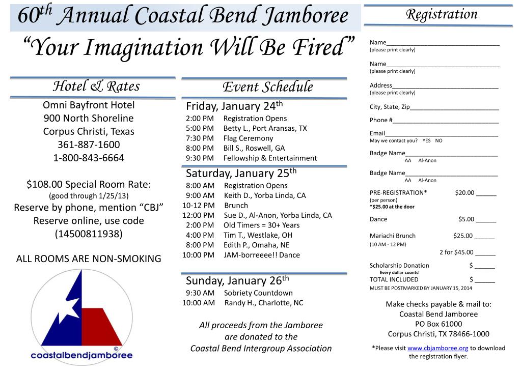 Join us for the 60th Annual Coastal Bend Jamboree in Corpus Christi, Texas! Register early for just $20 (or $25 at the door). Attend our Mariachi Brunch, enjoy dance events, and participate in the scholarship program. The event runs from January 24-26, 2014, featuring various speakers, workshops, and entertainment. Secure your hotel room at Omni Bayfront with a special rate of $108. All donations support the Coastal Bend Intergroup Association. Don’t miss this opportunity to connect and celebrate!