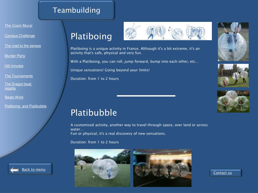 Teambuilding The Giant Mural Campus Challenge The road to the senses Platiboing Platiboing is a unique activity in France. Although it's a bit extreme, it's an activity that's safe, physical and very fun. With a Platiboing, you can roll, jump forward, bump into each other, etc… Unique sensations! Going beyond your limits! Duration: from 1 to 2 hours Platibubble A customised activity, another way to travel through space, over land or across water… Fun or physical, it's a real discovery of new sensations. Duration: from 1 to 2 hours Murder Party 100 minutes The Tournaments The Dragon boat regatta Beats Work Platiboing and Platibubble Back to menu Contact us