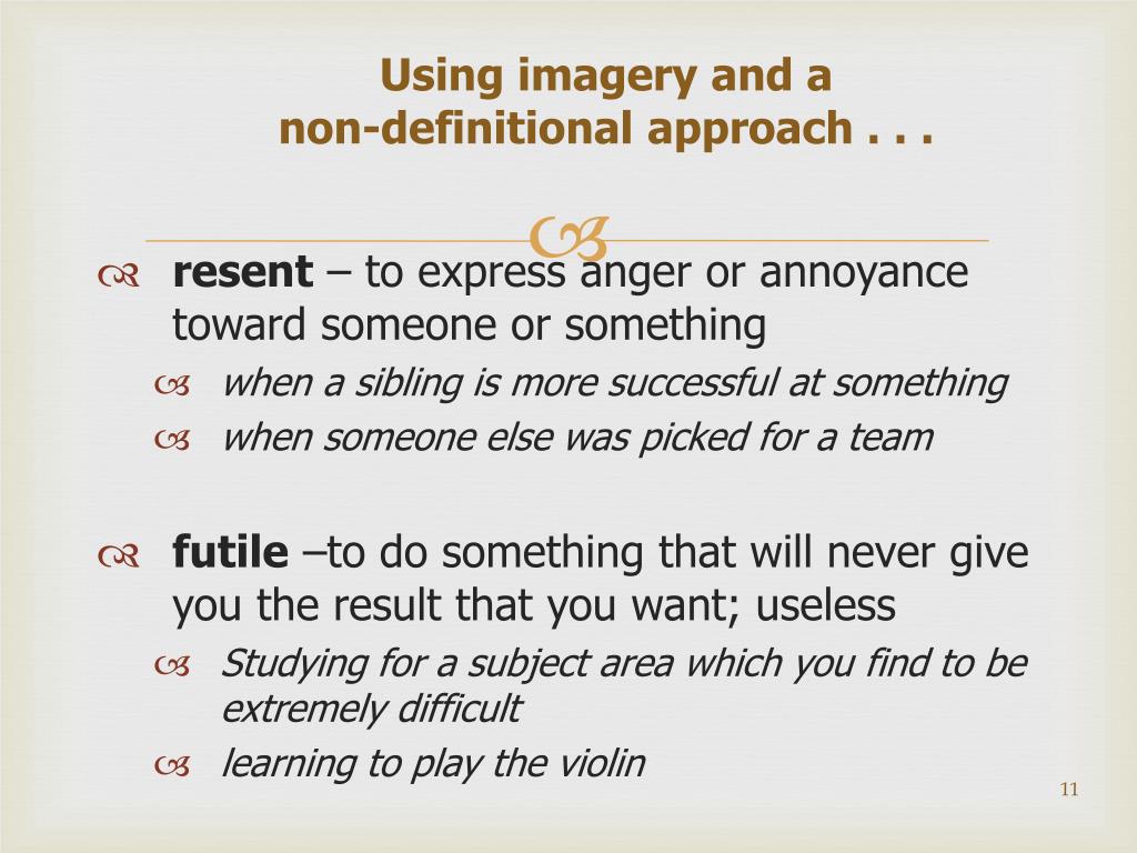 Using imagery and a non-definitional approach . . . • resent – to express anger or annoyance toward someone or something • when a sibling is more successful at something • when someone else was picked for a team • futile –to do something that will never give you the result that you want; useless • Studying for a subject area which you find to be extremely difficult • learning to play the violin