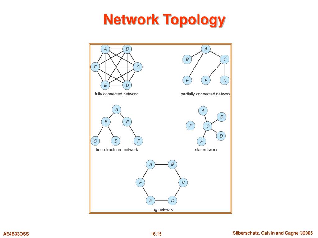 Network Topology • Sites in the system can be physically connected in a variety of ways; they are compared with respect to the following criteria: • Basic cost - How expensive is it to link the various sites in the system? • Communication cost - How long does it take to send a message from site A to site B? • Reliability - If a link or a site in the system fails, can the remaining sites still communicate with each other? • The various topologies are depicted as graphs whose nodes correspond to sites • An edge from node A to node B corresponds to a direct connection between the two sites • The following six items depict various network topologies