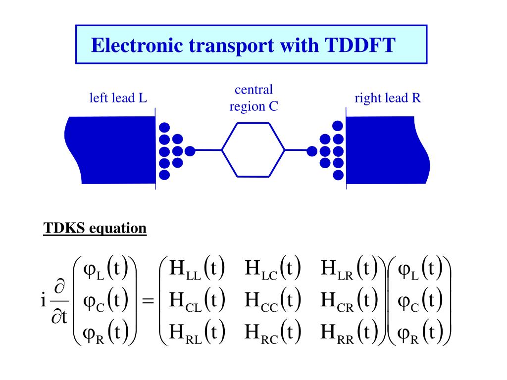 Electronic transport with TDDFT central region C left lead L right lead R TDKS equation